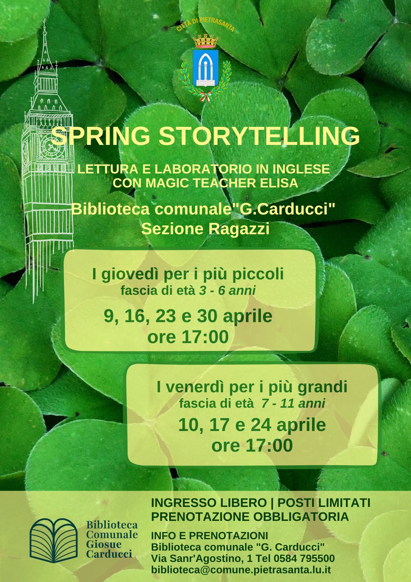 SPRING STORYTELLINGLETTURA E LABORATORIO IN INGLESE CON MAGIC TEACHER ELISABiblioteca comunale"G.Carducci"Sezione RagazziI giovedì per i più piccoli fascia di età 3 - 6 anni9, 16, 23 e 30 aprile ore 17:00I venerdì per i più grandi fascia di età 7-11 anni10, 17 e 24 aprile ore 17:00INGRESSO LIBERO | POSTI LIMITATI PRENOTAZIONE OBBLIGATORIA